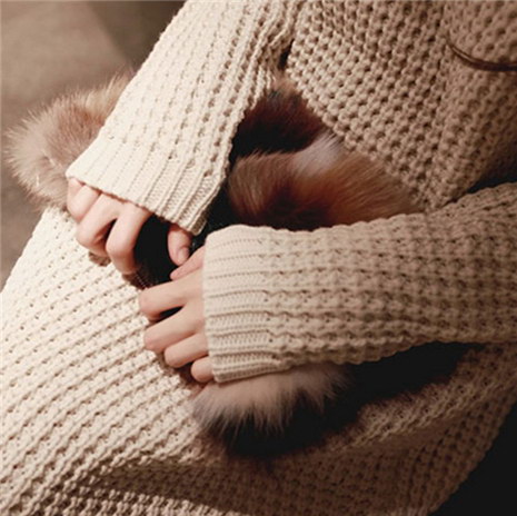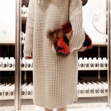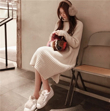 秋冬季加厚高领套头宽松长款开叉粗针连衣裙